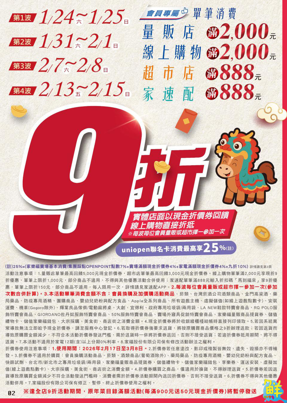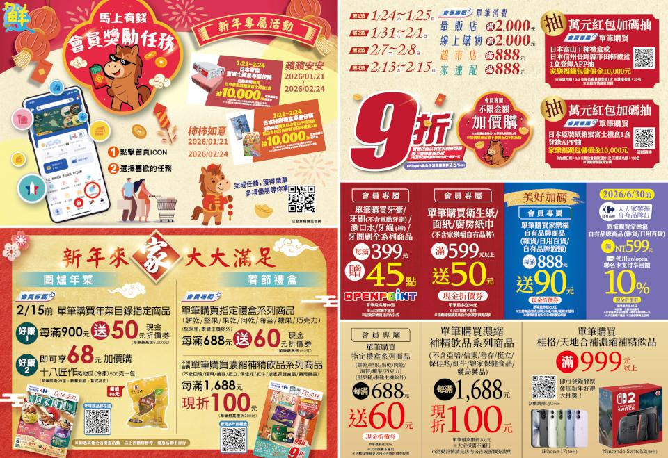 家樂福祭出超過2億5千萬回饋金,單筆消費達指定門檻即可享現金折價券或線上現折回饋,並結合OPENPOINT 點數回饋,指定商品最高回饋10倍。活動期間規劃四波指定假日(1/24–25、1/31–2/1、2/7–8、2/13–15),量販店/線上購物單筆滿2,000元,超市/家速配滿888元即可享9折折價券。