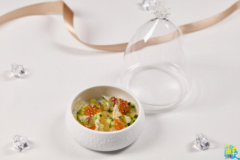 ▲開胃菜以鮭魚卵與小黃瓜佐日式高湯,口感清新而富層次。
