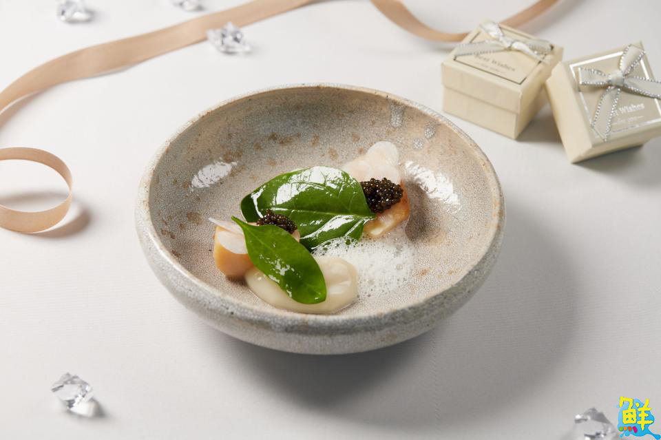 ▲前菜提供干貝搭配魚子醬與大根,展現海味的純淨鮮甜。