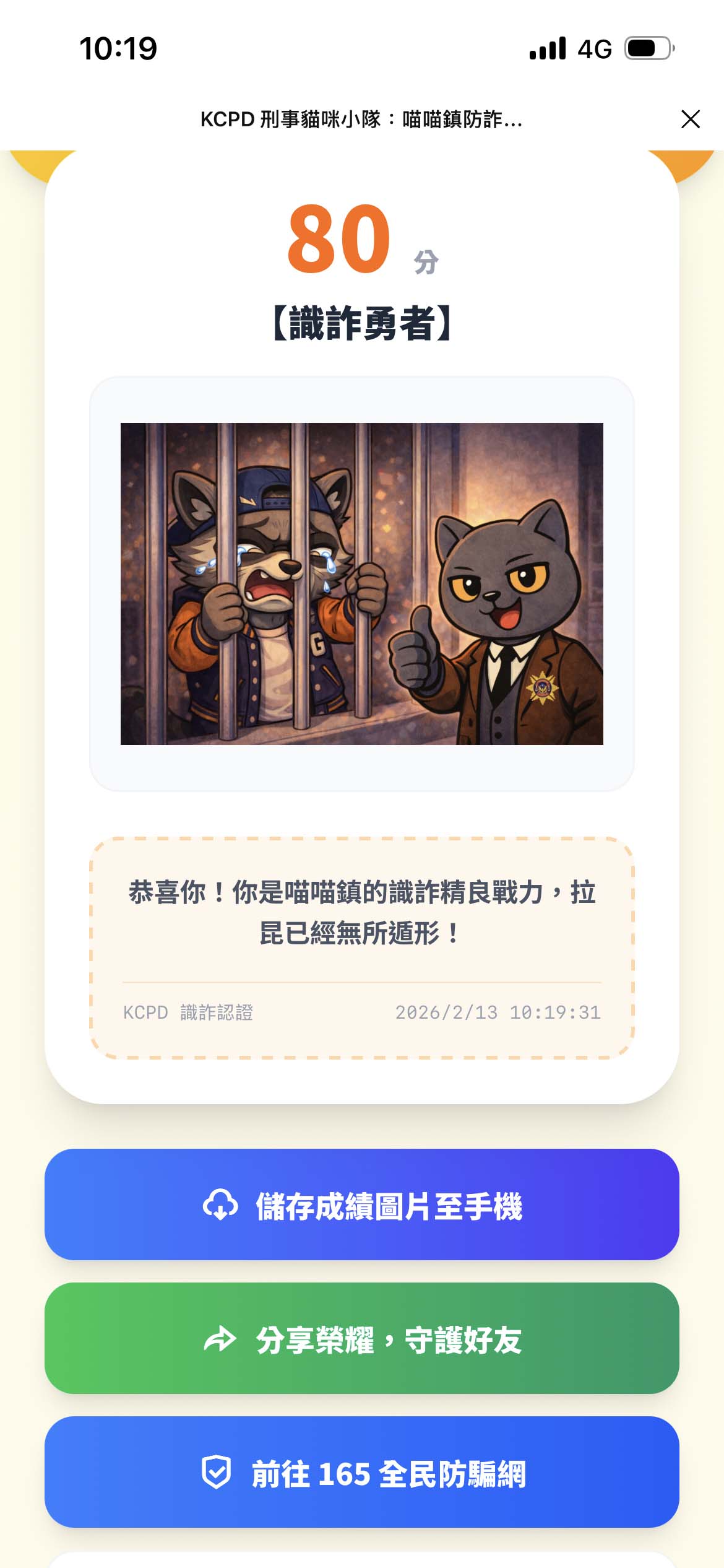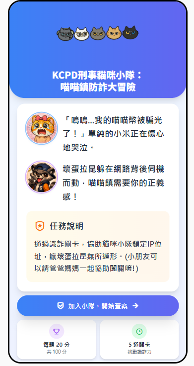 高市警察局刑事警察大隊文創IP刑事貓咪小隊新推互動式反詐騙測驗官網(https://liff.line.me/2009093591-j8B0xeCD),透過網路交友儲值詐騙、保證獲利投資話術、假普發現金簡訊釣魚、假冒警察涉洗錢監管、網購訂單錯誤要求ATM操作等5道貼近生活情境題,強化民眾識詐能力。完成測驗依分數獲得專屬稱謂90至100分識詐勇者、70至89分識詐尖兵提、60至69分識詐見習生、60分以下識詐警訊,刑大表示,詐騙型態日新月異,線上互動式測驗結合故事、Q版角色與情境設計,落實識詐教育貼近生活。圖/市刑大提供、文/高培德
