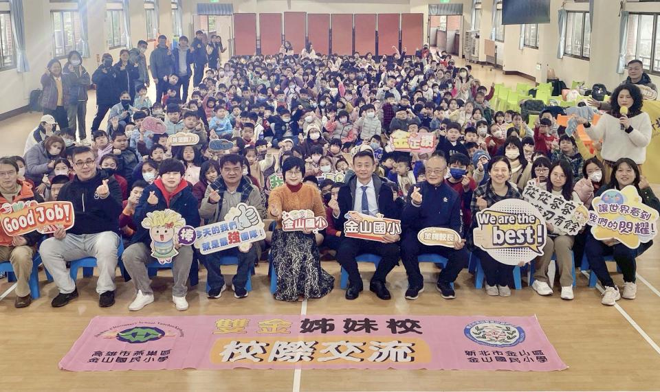 高市燕巢區金山國小1月22日畢業旅行首度參訪新北市金山區金山國小,高市金山國小十鼓、新北市金山國小舞蹈表演為兩校交流揭開序幕,在退休校長張瑞松等人見證下,高市燕巢區金山國小校長邱世杰(圖一右二)也與新北市金山國小校長楊智先(圖一左二)簽定協議締結姊妹校, 邱世杰說,全校師生不足百人,校園迷你優美,重視學生品德教育與適性發展,課程設計融入農產與泥岩火山地質,並發展十鼓、扯鈴、書法、足球、舞蹈等社團,感謝退休校長蔡佩娟牽線與新北市金山國小用心規劃,畢業旅行走訪野柳國家公園、十分瀑布、平溪老街等景點,鼓勵學生走讀學習,落實學用合一、拓展視野。楊智先說,兩校相距逾300公里,成為全台唯二雙金姊妹校,持續深化合作,學校重視情境學習,透過交流演出及入班觀課,了解學校與家鄉,學習溝通合作及同理差異。圖/教育局提供、文/高培德
