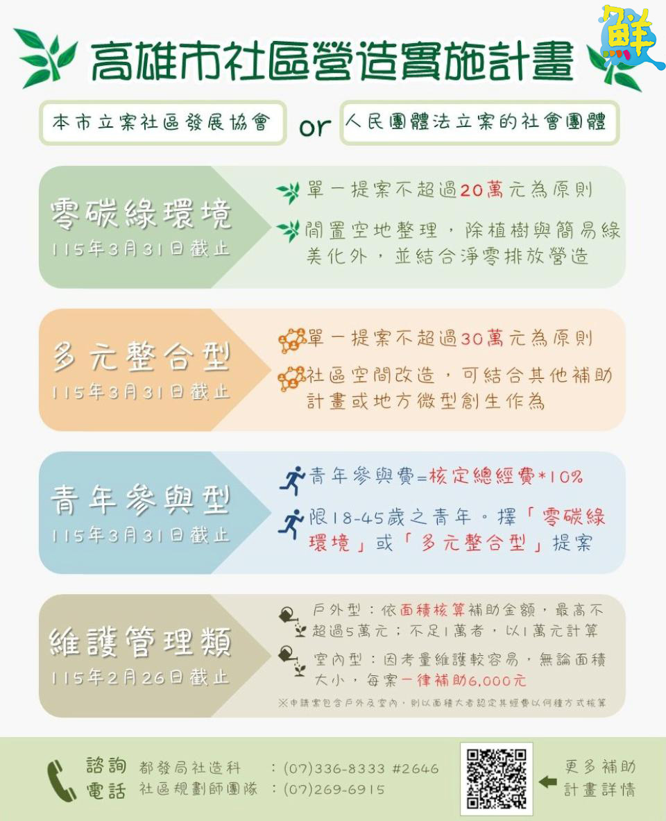 高市府都發局啟動「115年度高雄市社區營造實施計畫」,即日起受理申請。除延續以往新增社造點及維護管理補助機制外,特別新增「青年參與型」社造方案,鼓勵18至45歲青年實際投入社區營造行動,為社區發展注入創新能量。新增社造點如零碳綠環境、多元整合型及青年參與型至115年3月31日截止,而既有社造點維護管理至115年2月26日截止。歡迎符合資格的社區及青年踴躍提案。