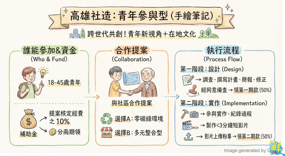 今年度亮點「青年參與型」,都發局指出,青年須與社區合作,擇定「零碳綠環境」或「多元整合型」提案,實際參與社區調查、計畫撰寫、提案簡報及後續實作,青年參與經費原則為社區核定補助款的10%,透過制度化支持,引導青年深入認識在地文化與永續議題,培育社區營造的新生代力量。