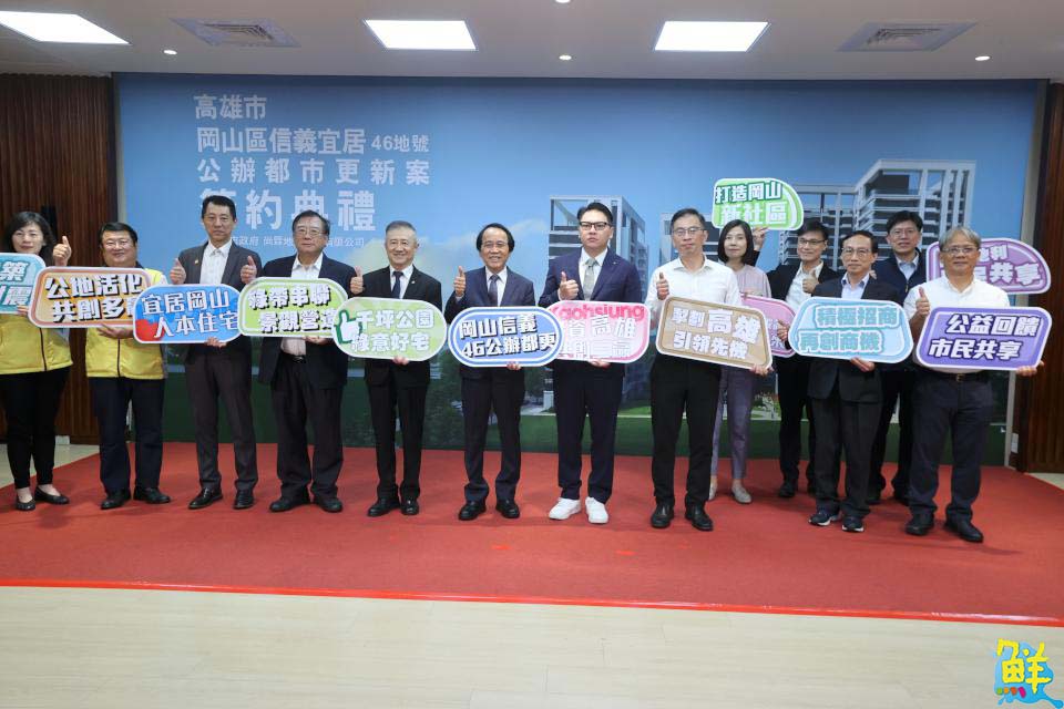 高雄市政府今(18)日辦理岡山區信義段46地號公辦都市更新案簽約典禮,由副市長林欽榮代表市府,與尚霖地產董事長鍾育霖正式簽署委託實施契約