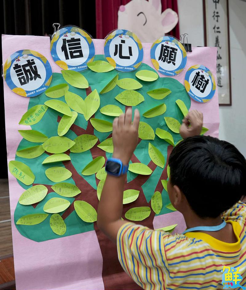 ▲孩童在誠信心願樹上貼上自己的願望