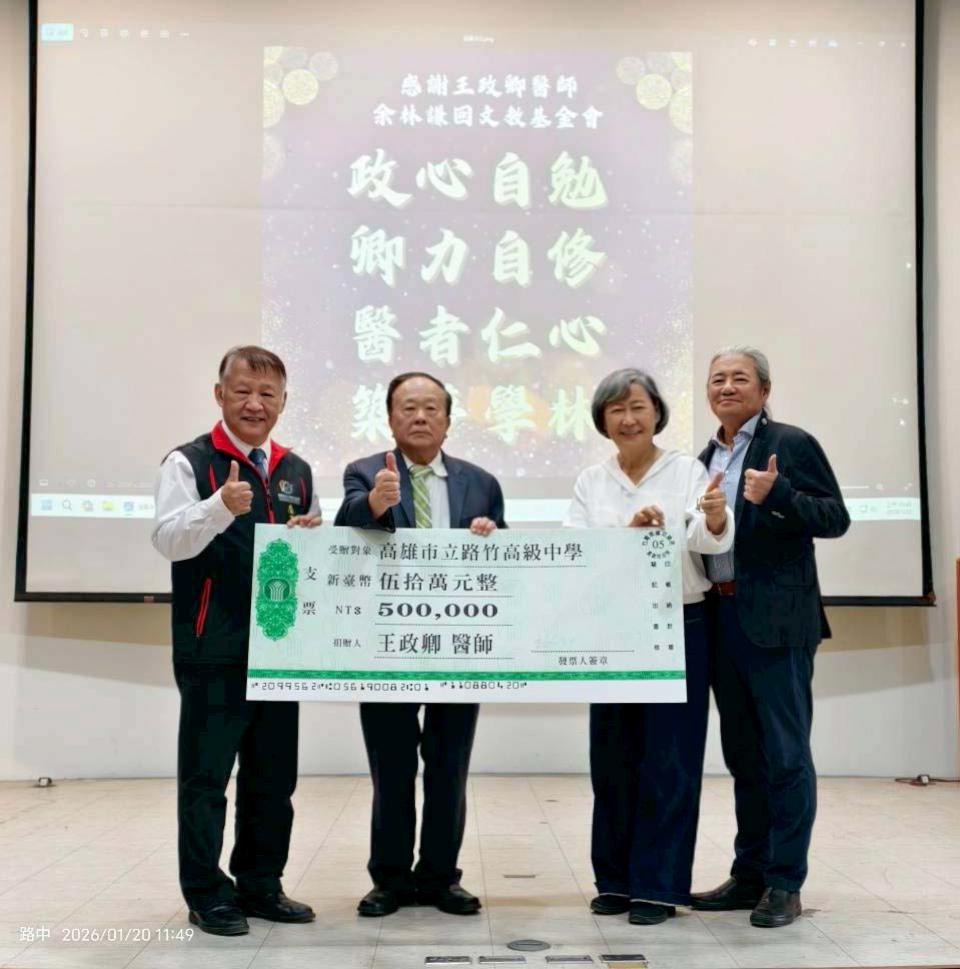 高市路竹高中1 月 20 日舉行王政卿醫師獎助學金余林謙回文教基金會頒獎典禮,獎助每名國中生每人3000元,高中生每人5000元,錄取台灣大學、清華大學、成功大學等國立大學及醫學系學生每人最高30000元,醫師王政卿、余林謙回文教基金會代表、竹滬國小校長梁正宏、文賢國小校長張國輝等人見證,路竹高中十鼓社、實習老師歌仔戲梁祝橋段等接力炒熱氣氛,主辦單位規劃114年至118年捐助250萬元,獎助優秀學生。