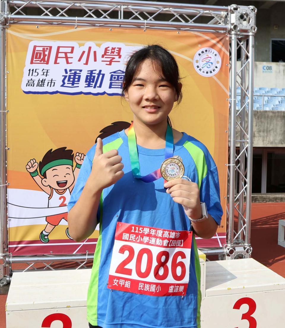 115年高市國小運動會1月21日至23日在國家體育場舉行,規劃田徑、籃球、排球、桌球等12項賽事,三民區民族國小六年級學生盧諠樂(圖四)7公尺93勇奪女子鉛球冠軍,也成為大會送出首面金牌。