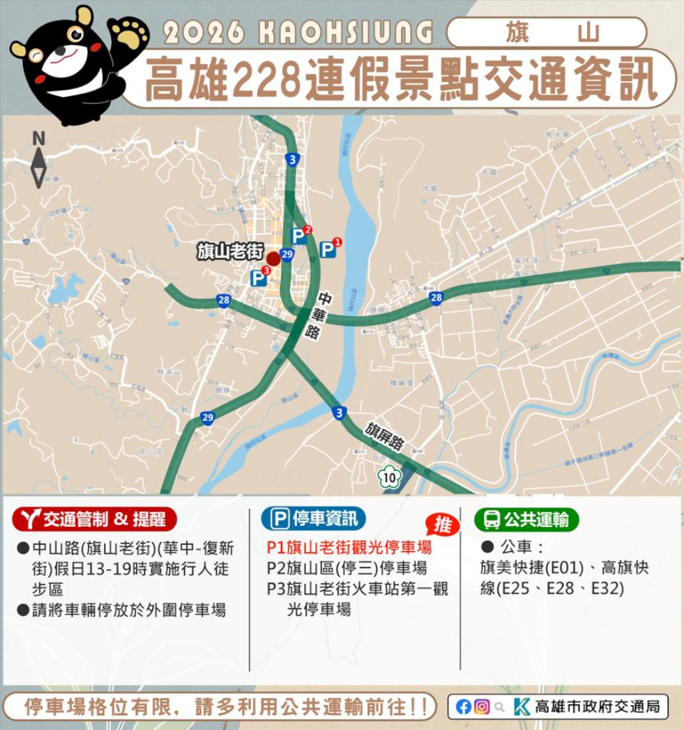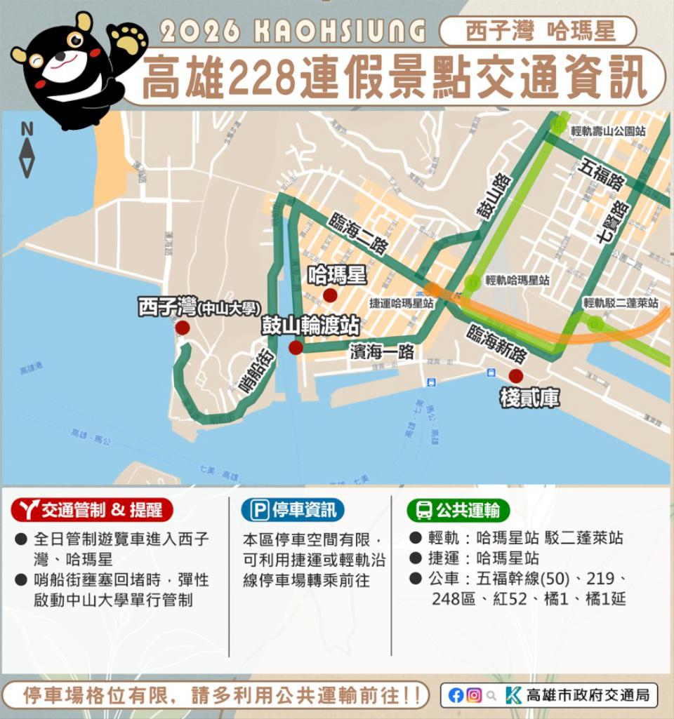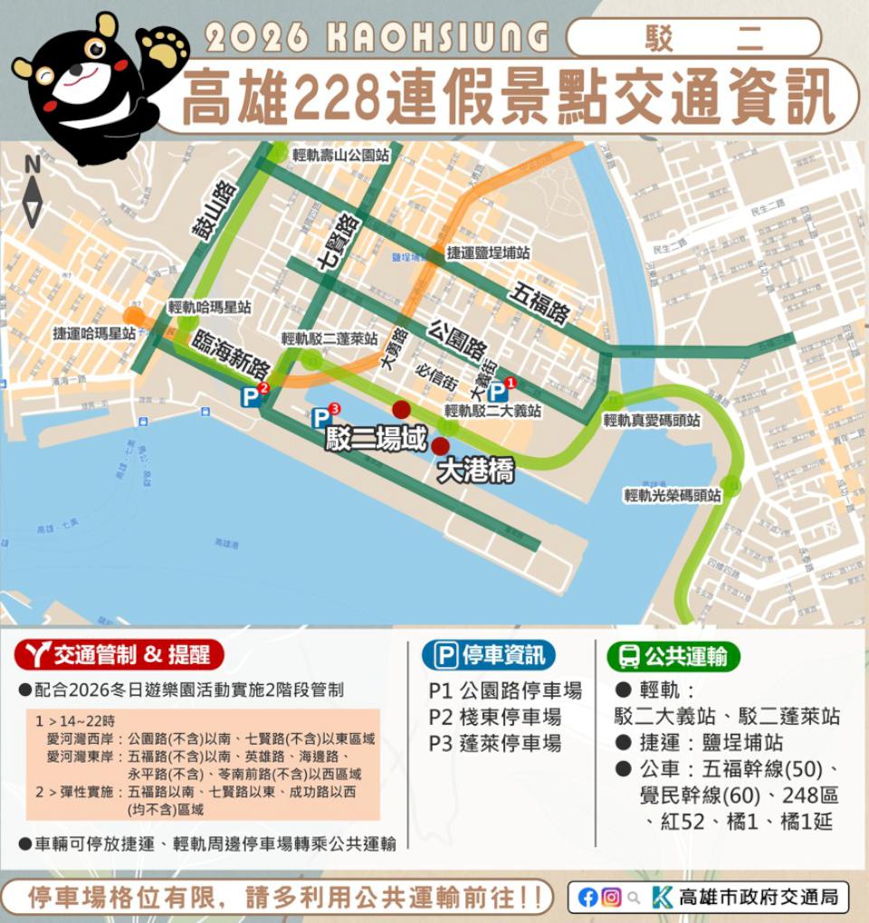 2月27日至3月1日228和平紀念日連假,高市交通局預估預期返鄉出遊人潮眾多,根據旗山、美濃、佛光山、旗津、西子灣、哈瑪星、駁二藝術特區等景點人流機動交管,2026 高雄冬日遊樂園(Kaohsiung Wonderland)會場周邊五福三、四路、七賢三路、成功路、海邊路等階段性交管,鼓勵民眾善用捷運、輕軌、市公車等代步。