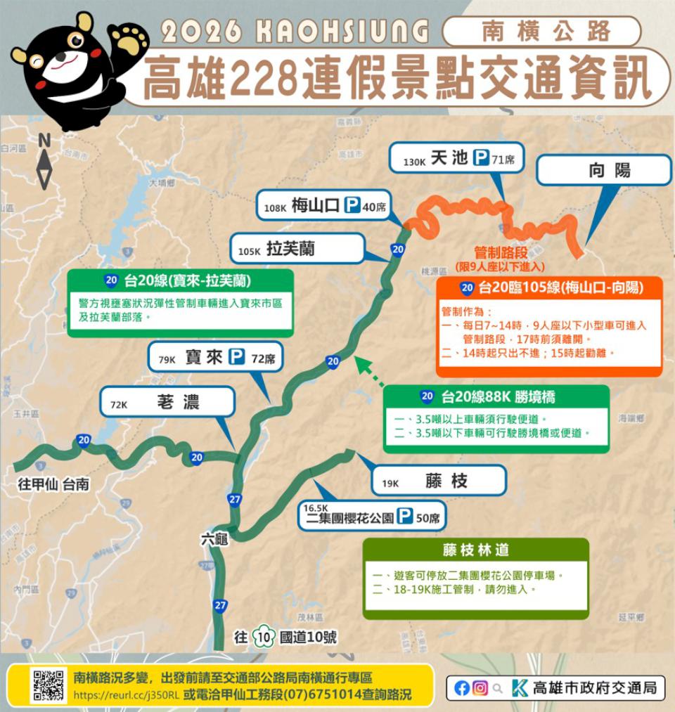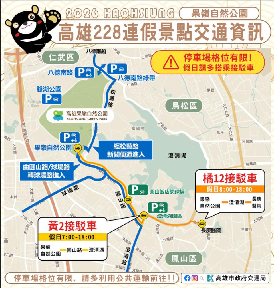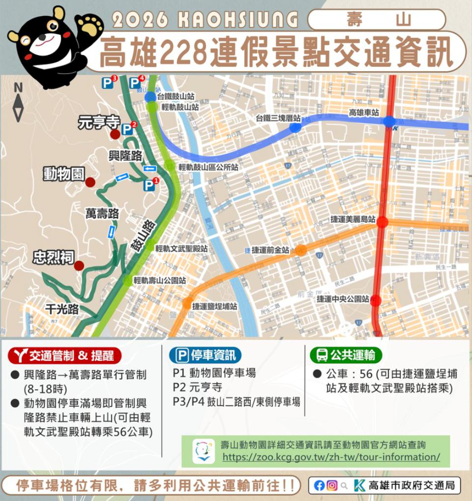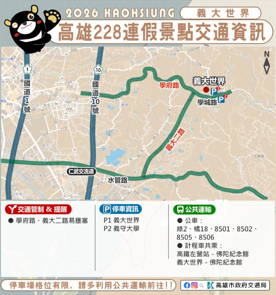 2月27日至3月1日228和平紀念日連假,高市交通局預估預期返鄉出遊人潮眾多,根據旗山、美濃、佛光山、旗津、西子灣、哈瑪星、駁二藝術特區等景點人流機動交管,2026 高雄冬日遊樂園(Kaohsiung Wonderland)會場周邊五福三、四路、七賢三路、成功路、海邊路等階段性交管,鼓勵民眾善用捷運、輕軌、市公車等代步。