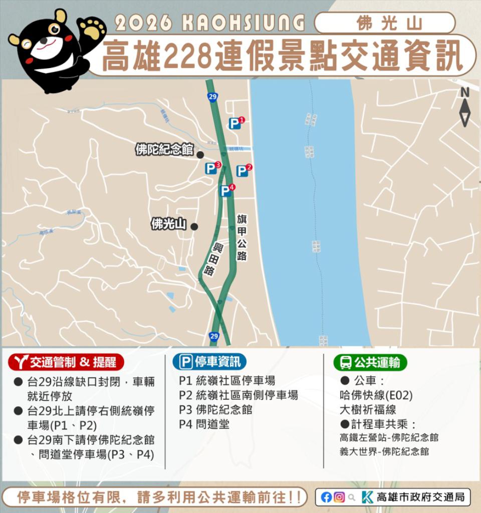高市大樹區佛光山寺周邊台29線預期湧現車潮彈性交管,參與燈會民眾可至高鐵左營站搭乘哈佛快線或8501、8502等快捷公車,美濃區台28線與中山路車多,善用指定停車場或提前改道。旗山轉運站假日提供至內門野森動物學校接駁服務,配合交通部公路局旗山台3新旗尾橋改建北側封閉施工,南側維持雙向通行,建議旗山方向提前下國道10號嶺口交流道改走台29或從10旗山端直行高140旗屏一路轉台3旗山橋,連假交管資訊可上高雄旅遊網、交通局官網及轉動高雄青春夢官方社群查詢。圖/交通局提供、文/高培德