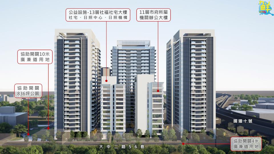 其中,第五種住宅區劃為都市更新單元 1及單元2分別招商,均由尚發營造得標,於112年及113年完成委託實施契約簽署,並由實施者提出兩單元整併開發方案,預估投資總額高達152億元。未來在第五種住宅區內,將興建5棟高品質住宅大樓、1棟工務局綜合辦公大樓,以及1棟13層樓的公益設施社會福利大樓。此外,契約同時要求實施者須協助開闢836坪公園用地,及廣場兼道路用地,回饋予全民共享。公園用地的地下附建停車場,提供15個工程車停車位供工務局使用。