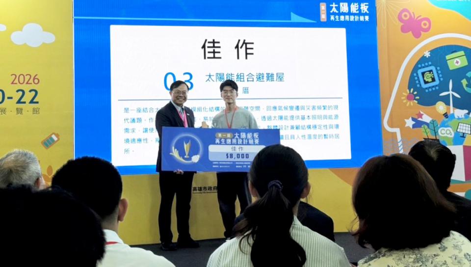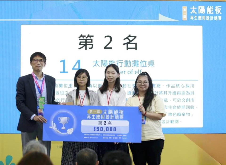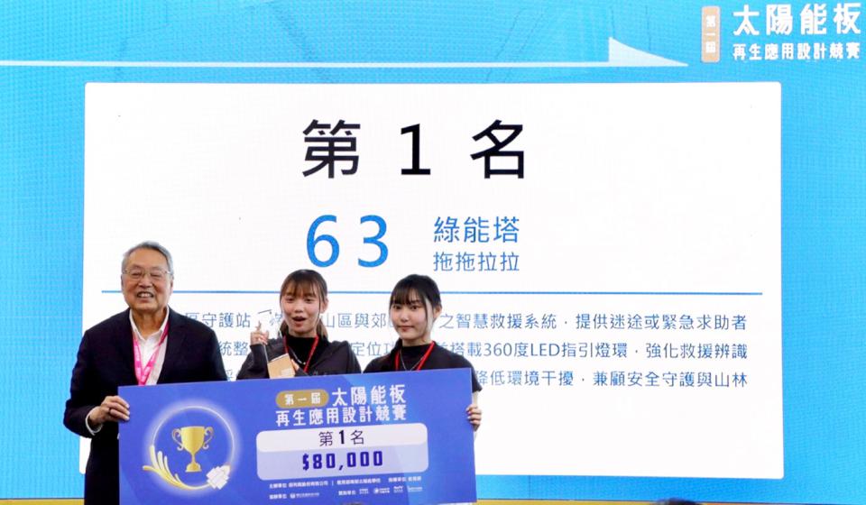 高市義守大學創意整合設計系學生江詠琇(圖一右一)、蘇怡文(圖一左二)回收太陽能板設計綠能塔,第一屆太陽能板再生應用設計競賽合摘金牌,另何語宸(圖二右二)、曾筠惠(圖二右一)、李愷文(圖二左二)等3名學生開發太陽能行動攤位車拿下銀牌,謝佑安(圖三右一)、廖偲絜太陽能組合避難屋獲得佳作,江詠琇與蘇怡文觀察山難常因缺電及通訊不佳延誤救援時機,綠能塔兼具自主發電、高效能引導燈及高功率揚聲器,輔助登山客辨識方向及求救,體現資源再利用精神。