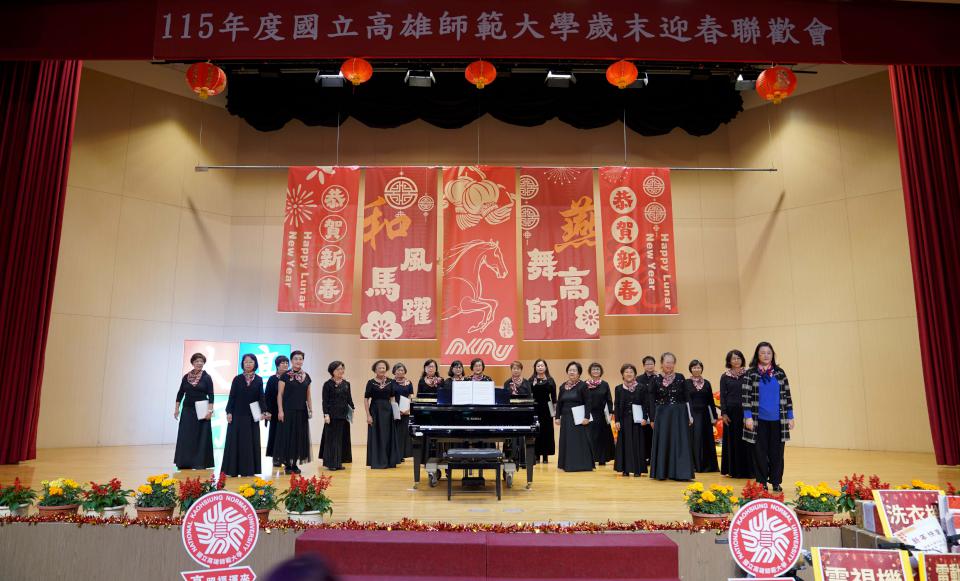 國立高雄師範大學2月11日舉行115年歲末迎春聯歡會,主題定為「和風馬躍‧燕舞高師」,校長王政彥、副校長唐硯漁、李昭蓉、前校長黃正鵠、戴嘉南、蔡培村、吳連賞、前副校長柳賢、王惠亮等人頭戴春節髮箍、手持書法碩士在職專班學生書寫「好事立馬」春聯參與同樂。