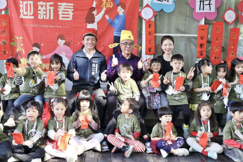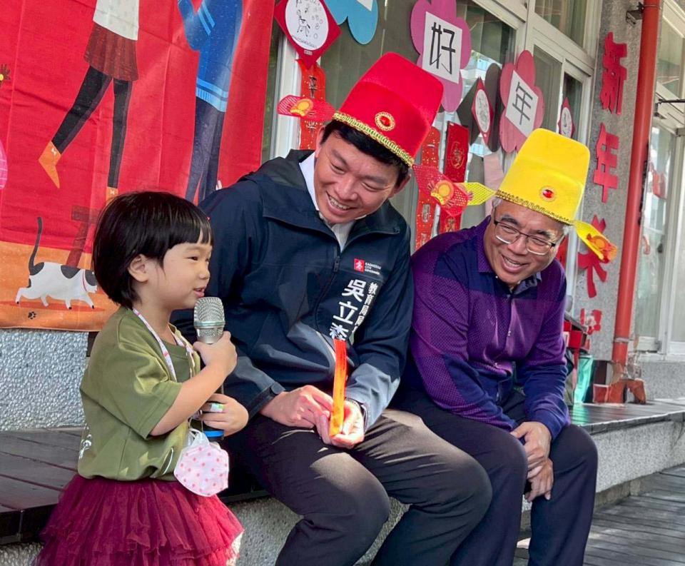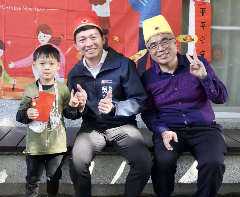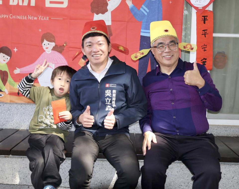 教育局長吳立森、河堤國小校長杜昌霖戴帽化身財神發送學童彩繪內含金幣巧克力紅包,並用「新年快樂」、「年年有餘、平安健康、步步高升」等祝福話語表達感謝,吳立森說,身為3名子女父親,其中2人就讀幼兒園,深刻體會教育攸關孩子成長,樂見校方用心規劃,提供學童學習機會。