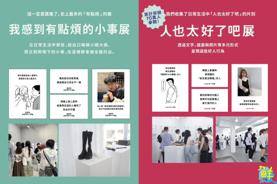 《人也太好了吧展》收藏了生活中的「超好人瞬間」。展覽透過照片、插畫與文句,把這份溫度具象化,讓每位觀眾都能在展場裡,找到與自己生命相遇過的好人影子。而《我感到有點煩的小事展》收集那些看似微不足道、卻會讓人心裡默默感到在意的小事,在展場裡都被轉化為充滿幽默感的文字與視覺創作,讓觀眾一邊看展,一邊忍不住點頭狂笑:「對!就是這種感覺!」不僅呈現吐槽式幽默,也溫柔提醒大家——允許自己有點煩,其實是一種誠實面對情緒的方式。