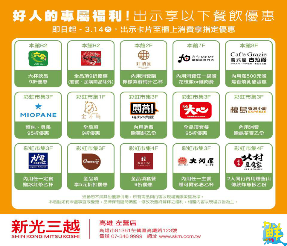 好人的專屬福利來了!凡持高雄站限定發行之「好人卡」,於即日起至 3/14(六)止,至指定館內餐飲櫃位出示「好人卡」即可享有專屬優惠。優惠內容及參與店櫃以現場公告為準。