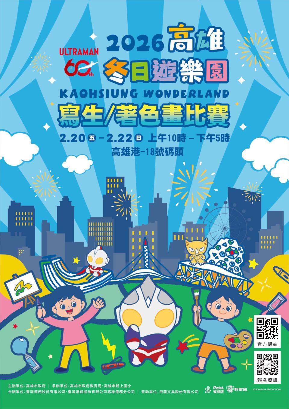 2026 Kaohsiung Wonderland 高雄冬日遊樂園2月7日至3月1日在愛河灣與高雄港16號至18號碼頭同步舉行,主題聚焦「超人力霸王降臨港都」,結合港灣景致規劃主題裝置、燈光秀、見面會、碼頭樂園等互動展演,高市教育局冬日遊樂園寫生暨著色畫比賽2月20日至22日上午10點至下午5點在高雄港18號碼頭登場,邀請參賽者畫出心目中勇敢超人,完成繳件可獲扭蛋機會,有機會帶走限量大獎,1月24日上午10點歡迎上高雄數位市民系統登錄報名,教育局感謝臺灣港務合辦,飛龍文具贊助支持,教育局也規劃專車接送偏遠及非山非市學校學生參與高雄燈會系列活動,相關活動資訊可上官網(kh-duoyuan.com)查詢。圖/教育局提供、文/高培德