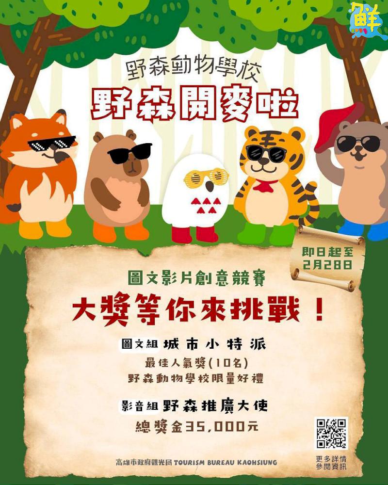 觀光局說明,「野森開麥啦」競賽期間自2月1日起至2月28日止,為期一個月,分「城市小特派」(圖文組)與「野森推廣大使」(短影音組)兩大組別。「城市小特派」創作者只要在活動期間於臉書FB或IG發布具有「野森動物學校」意象之城市宣傳場景(如路燈旗、公車車體、輕軌彩繪列車、捷運燈箱及車廂)或試營運活動體驗之圖文,Hashtag「#動物是最棒的老師」即可參加比賽,臉書FB或IG貼文互動人氣前10名作品將獲得「野森動物學校」限量玩偶。