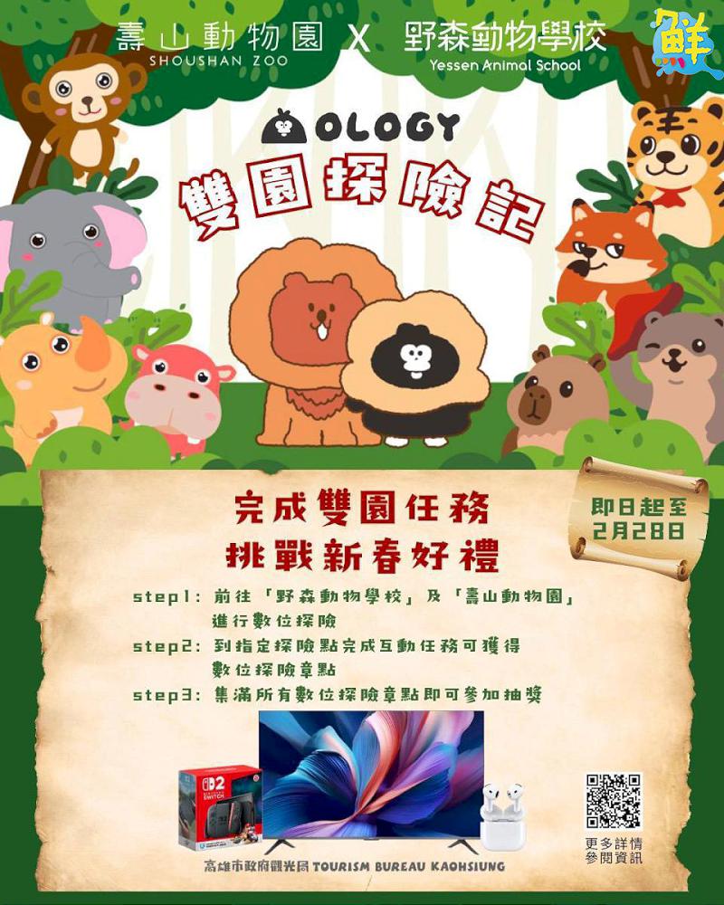 此外,百萬人氣插圖角色「掰掰啾啾奧樂雞」首次跨足動物界,由奧樂雞擔任探險隊長,帶領民眾走進「壽山動物園」與「野森動物學校」,展開2月限定「雙園探險記」。活動結合數位互動任務與豐富摸彩獎項,禮品包含55吋QLED 電視、Switch、AirPods 等總價值10萬元大獎。邀請大小朋友透過活動專屬官方line互動遊戲,認識動物與自然生態,開啟最有趣的親子冒險旅程。