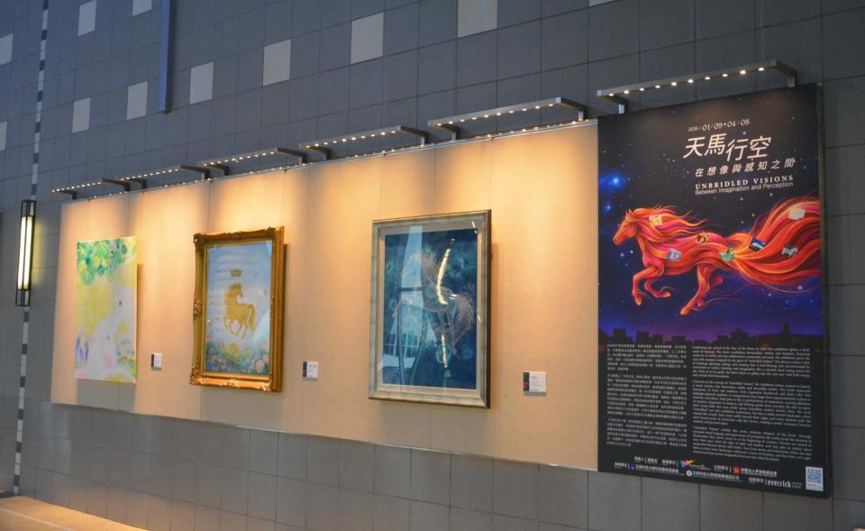 昇恆昌基金會主辦、高市正修科技大學科技藝術發展處策畫《天馬行空:在想像與感知之間》創作聯展,1月9日至4月8日在高雄國際機場國際線出境大廳3樓中央藝廊舉行,匯集正修科大科藝處處長吳守哲「雙炎啟程・勢變之境」、陳江富「光炎奔馳・能量臨界」、鍾佳臻「豐盛之旅」、鄭美莉「飛馬翩翩」、蔡秀蘭「希望」、吳敏華「天馬騰空」、劉瓊芬「光羽奔行」、「破框之躍」、陳麗娟「圍城」、「紅塵取經」、陳思穎「小丑與馬」、黃暄軒「賽博格的牧歌」、蔡獻友「形象磁場 No.8」、「立馬見影」、蔡秉旂「恬靜的月」、曾靜芳「心馳」、朱能榮「家人」、林純敏「搖搖搖搖到外婆橋」、張茹甄「豐盛」、黃暄軒領軍仁和社區16名成員「群馬之相–1」、「群馬之相–2」、等28件作品。圖/正修科大提供、文/高培德