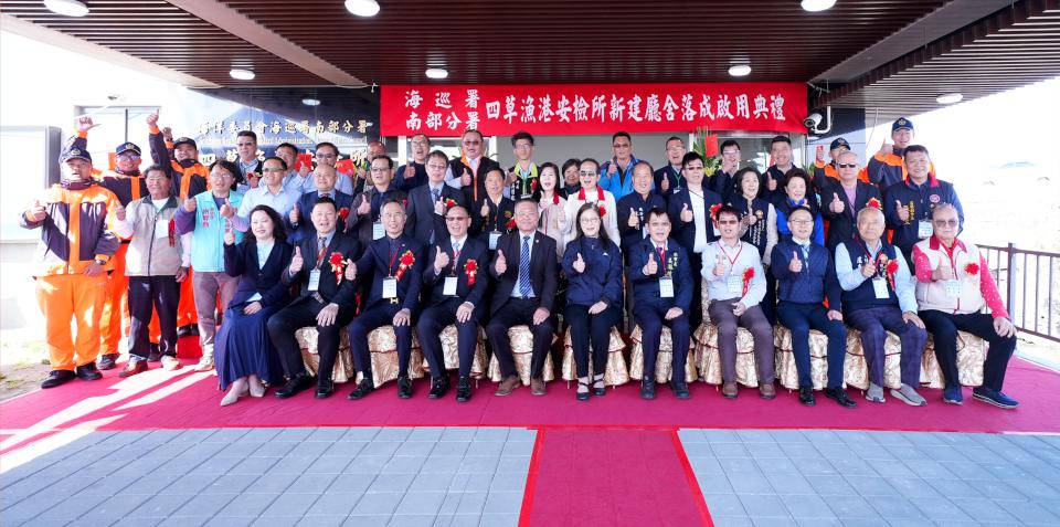 海巡署南部分署草漁港安檢所新建廳舍1月28日落成啟用,海洋委員會主委管碧玲、海巡署南部分署分署長鳳運昇、台南市副市長姜淋煌等人見證誌慶,管碧玲說,海巡署肩負國安、治安、平安等核心任務,海上執勤風險高,過去一年成功救援約600人,其中外籍人士逾百人,查扣毒品等13819 公斤。