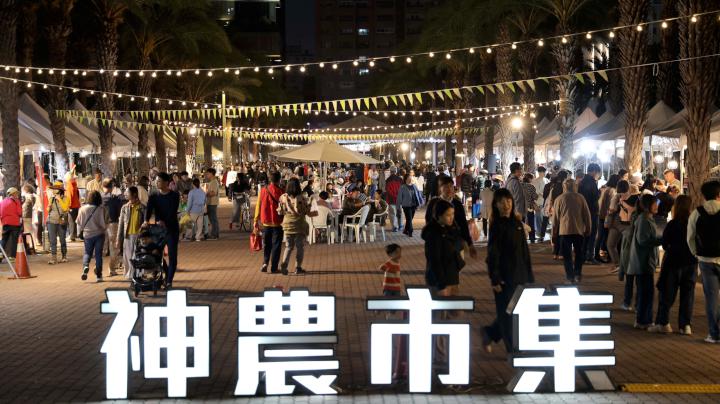 高市農業局神農市集1月31日及2月1日下午3點至晚上9點在凹子底森林公園舉行,主題定為「花開富貴迎馬年」,集結逾百攤位展售優質農特產、花卉,串連燈飾及旗幟營造暖色文青氛圍,吸引不少民眾駐足拍照打卡。